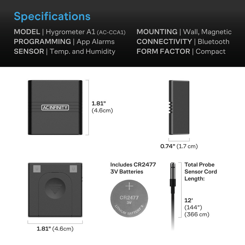 Mini Smart Termo-Hygrometer A1 | AC Infinity - Termohigrómetro inteligente con sensor de 12'