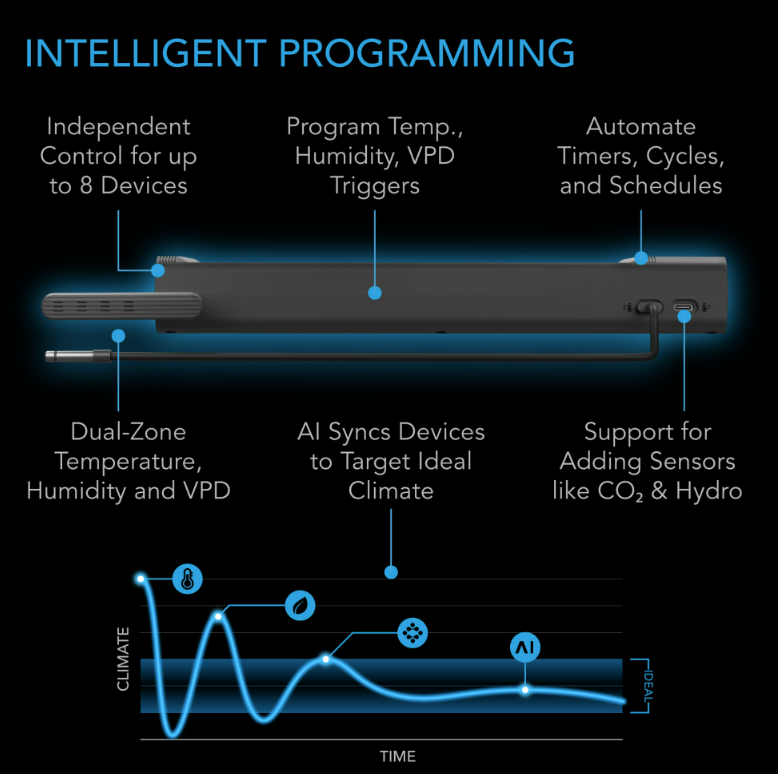 - Monitorización de precisión con seguimiento de temperatura, humedad y VPD en dos zonas, además de sensores opcionales de CO₂, hidroeléctricos y de suelo (se venden por separado) para configuraciones avanzadas.