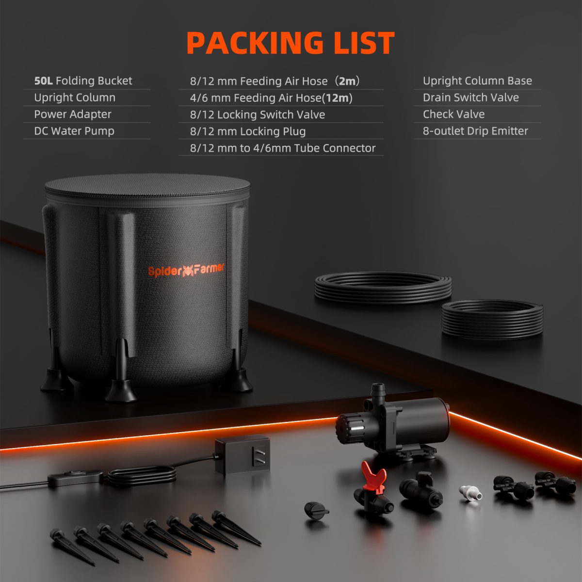 El Sistema de Riego por Goteo Automático Spider Farmer es una solución integral y eficiente para la irrigación automática de plantas. Incluye una bomba de agua inteligente de 25W, un tanque de gran capacidad de 13 galones y 8 emisores de goteo ajustables, diseñado para optimizar el uso del agua y promover un crecimiento saludable en cultivos hidropónicos, en maceta o en suelo.