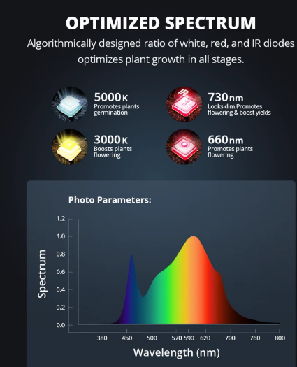 Además, su alta eficiencia LED de 2.3 μmol/J asegura un rendimiento excepcional con un consumo energético reducido, ayudándote a ahorrar en costos de electricidad sin comprometer la calidad de tu cultivo.
